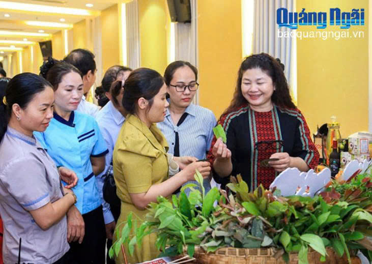 Du khách được giới thiệu về đặc sản gỏi lá Yến Vy tại gian hàng trưng bày nhân sự kiện Tọa đàm "Kết nối, hợp tác phát triển du lịch Quảng Ngãi " vào tháng 7/2025.